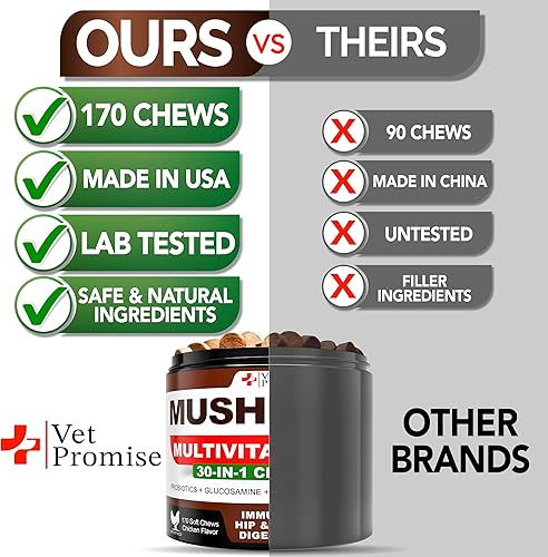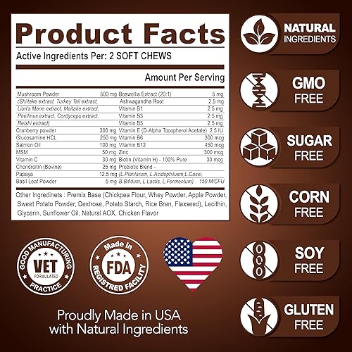 30-in-1 Dog Mushroom Multivitamin Chews: ffers a unique and effective blend of 7 mushrooms, including 6 probiotics, Omega-3 rich salmon oil, glucosamine, promoting your pet's overall wellbeing