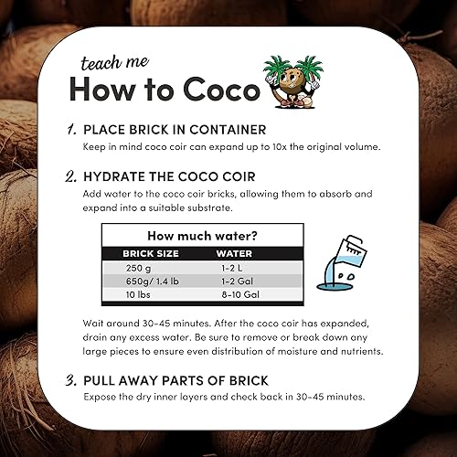 Easy-to-Follow Instructions for Use: Soak the coco coir brick in 6.5 gallons of water until fully expanded. Fluff it up to break any clumps, then spread evenly across the terrarium or vivarium to achieve the desired depth for your reptile's new, enriching substrate.