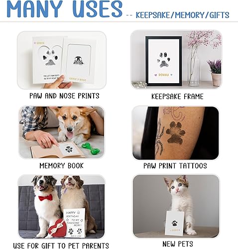 【Easy to Capture Clear Paw Prints】You'll find capturing your pet's paw prints is efortless with our inkless ink pads.Just combine the ink pad with the imprint paper and gently press your pet's paw.Our ink pads capture the details on your pet's paw prints,even for puppies and kittens(puppy paw print kit,cat paw print kit). All you need to do to get clear paw prints is follow our instructions! If you do it right,you can also use it as a dog nose print kit or paw print tattoos.One ink pad comes with 4 imprint papers to create multiple paw print keepsakes for your beloved pet and one ink pad can be reused 3-5 times