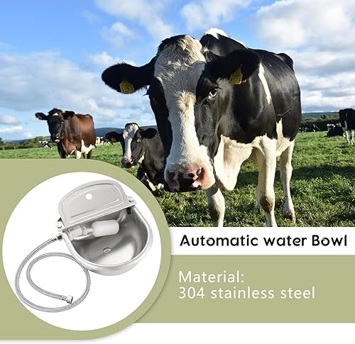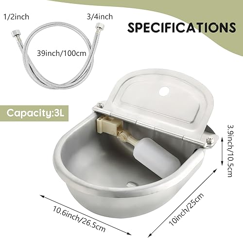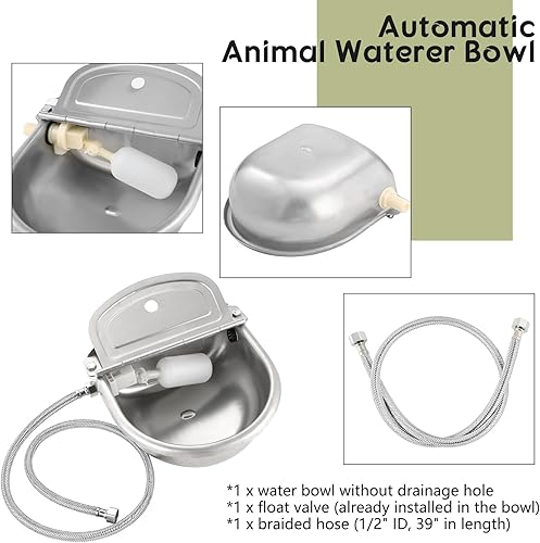 Package Included: 1 x stainless steel without drainage waterer, 1 x float valve (already installed in the bowl), 1 x braided hose (1/2" ID, 39" in length)