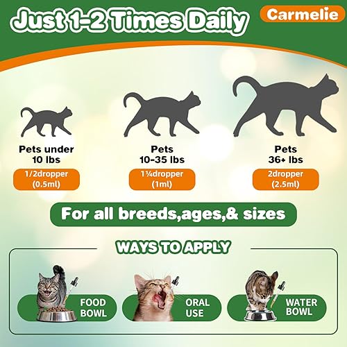 Easy To Use: Our drops come with a dropper that can be dropped into your cat's food or water, or directly into your cat's mouth. Use ½ dropper (0.5 ml) for cats under 10 lbs, 1¼ droppers(1.25 ml) for cats 10-35 lbs, and 2½ droppers(2.5 ml) for cats 35-75 lbs.Administer 1–2 times daily.