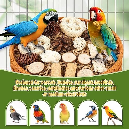 Natural & Safe Materials -- Our bird foraging box Crafted from natural material ,such as natural wood, sola ball,Corn leaf weaving sheet Loofah, pinecone,shredded paper etc ,and non-toxic faux rattan basket - no dyes, plastics, or harmful chemicals. Bird-safe chewing prevents beak overgrowth while satisfying natural shredding instincts,ensuring hours of worry-free fun for your bird friends , perfect for mental stimulation and physical activity.