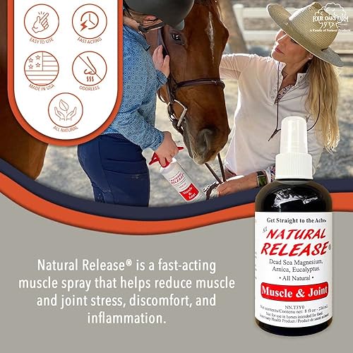 Get Straight to the Ache: Natural Release Muscle Relaxant Spray works in minutes to help reduce equine muscle and joint stress, arthritis, tendonitis, discomfort, bruising and inflammation. Can be used before or after physical exercise - we recommend both.