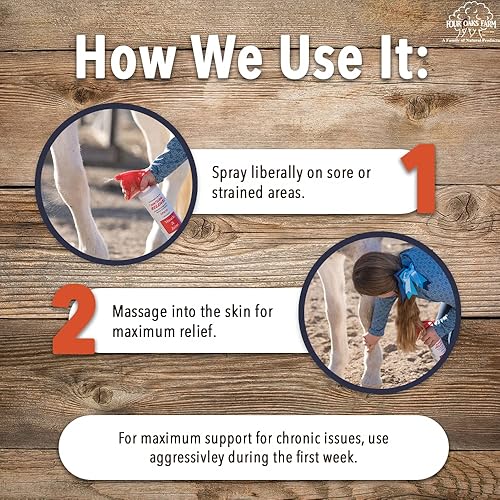 Easy to Use: All natural Horse Liniment combines transdermal Dead Sea magnesium, arnica, and eucalyptus to provide immediate relief. Spray liberally on sore or strained areas and massage into skin. For lingering strains, reapply after 15 minutes and then every 3-4 hours.