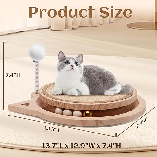 4-in-1 Design - This interactive cat toy is the perfect combination of a durable sisal scratching pad, a spring-loaded plush ball, and a track with a moving ball.The round cat scratcher pad design provides a comfortable resting place for your cat after playing