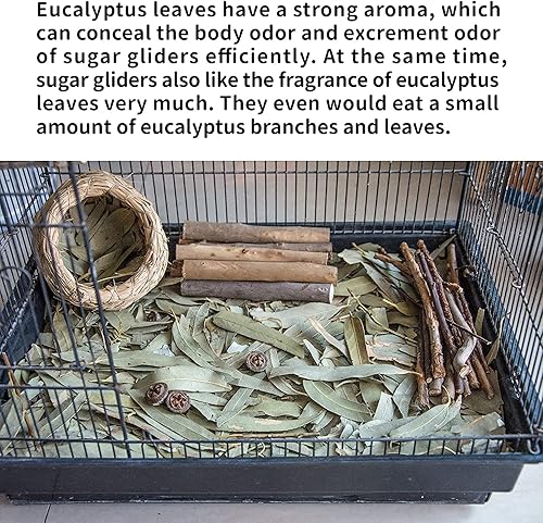 Eucalyptus leaves have a strong aroma, which can conceal the body odor and excrement odor of sugar gliders efficiently. At the same time, sugar gliders also like the fragrance of eucalyptus leaves very much. They even would eat a small amount of eucalyptus branches and leaves.