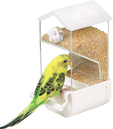【Double anti-splashing】The automatic feeder adopts a semi-enveloping design, with widened baffles at multiple angles to prevent the grain from splashing out, and an independent pullable food trough box at the bottom can effectively catch the empty food shell and uneaten grain, which is convenient for dumping and keeps the bird cage clean