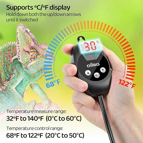 【Easy to Set】Simply use the 3 buttons on the reptile dimming thermostat to complete the desired temperature setting. Support change display between Fahrenheit and Celsius: hold down both the up/down arrows until it switched.