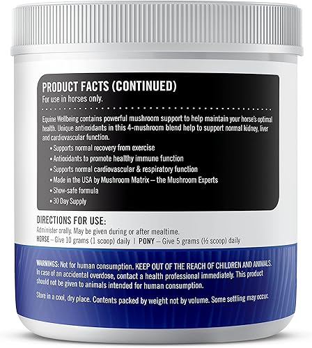 Mushroom Matrix Equine Wellbeing Organic Mushroom Powder Supplement for Horses & Ponies: Contains one 300 gram jar of proprietary 4-mushroom powder blend to support your horse or pony’s overall health & well-being (30 servings [10 grams] for a horse or 60 servings [5 grams] for a pony)