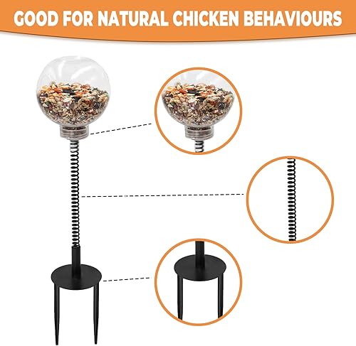 Innovative Design: The toy comprises three parts: a transparent plastic ball at the top for holding food, a middle metal spring that allows the ball to swing at various angles, and a bottom metal ground plug for easy fixation in the garden, lawn, or chicken coop. The plastic ball features three round holes that release food when the ball swings.