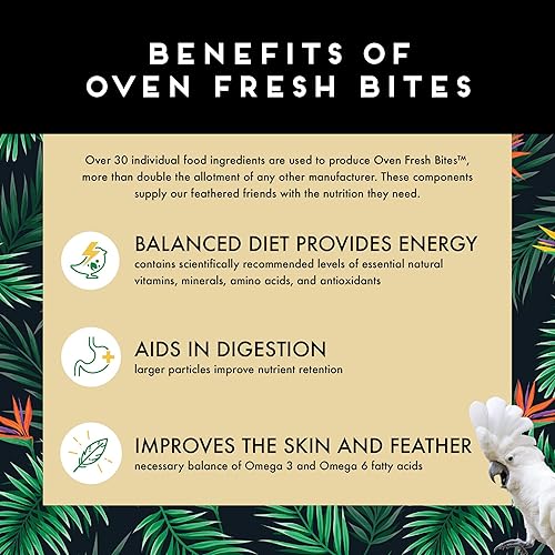 Over 30 nutritious ingredients: Unlike other parrot food, Oven Fresh Bites bird food does not utilize corn or wheat as the primary source of dietary energy and protein - and contains no added sugar, artificial coloring or flavors, and no chemical preservatives.
