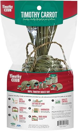PART OF OXBOW ENRICHED LIFE: Veterinarian-recommended & made with natural materials, this Timothy hay carrot chew toy blends play, nutrition, and safe enrichment to support the overall wellbeing of small pets including rabbits, guinea pigs & chinchillas.