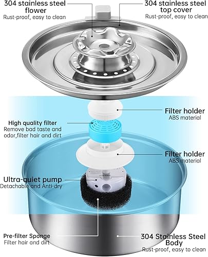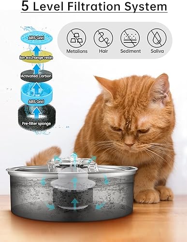 [High-Quality Materials]The cat fountain is made of 304 stainless steel, strong, durable, easy to use and easy to clean.Stainless steel tray and water storage bucket are dishwasher safe.