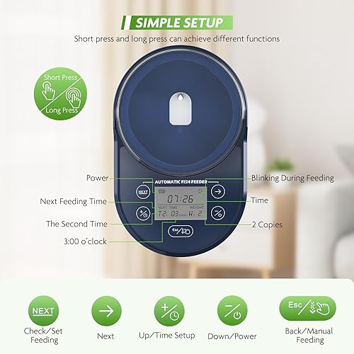 Flexible Feeding Schedule: The fish feeder is very convenient to set up. You could set the feeding time 0 to 6 times a day. Unlike traditional feeders with fixed feeding periods, it can be set to any time within a day according to your needs, ensuring your aquatic pets are fed at the most suitable moments throughout the day