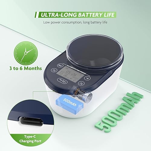 Ultra-long Battery Life: The timer fish feeder is equipped with a built-in 500mAh battery and a low-power motor. Once fully charged, it can normally be used for 3 to 6 months. It is charged via a Type-C port, which is efficient and stable, ensuring uninterrupted service for your beloved aquatic pets