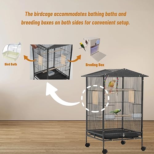 Thoughtful Design Details Featuring a charming pointed roof, bird cage large combines style with functionality. The front has a main entry door plus two feeding doors for easy access, and each side panel includes a window—perfect for hanging a bird bath or parakeet nest to enhance your bird’s environment.