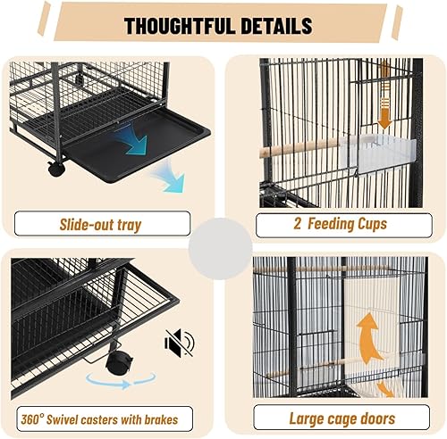 Easy to Move, Clean & Assemble Equipped with 360-degree rotating wheels with a brake, large bird cage for parakeets moves smoothly and stays stable when stationary. The bird seed catcher mesh design contains food scraps and feather dust, while a removable tray and bottom grille simplify cleaning—saving you time and effort. Plus, assembly is super easy, so you can set it up in no time.