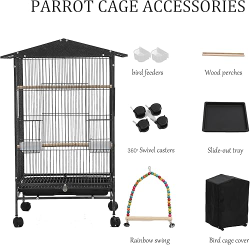 All-in-One Starter Kit Comes complete with essential accessories: a bird cage covers for night,wood parrot perches, food dishes, a bird swing, and a bird ladder for cage,bird cage netting seed catcher. No need to fuss with outfitting the bird cage with stand separately—everything you need is included, making setup a breeze for new and experienced bird owners alike.