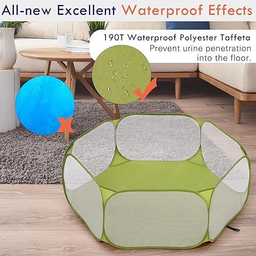 NO MESS - WATERPROOF DESIGN: 190T Waterproof Polyester Taffeta with the bottom of the pet playpen, effectively prevents urine penetration into the floor. The spacious opening at the top is easy to clean and allows power cords to pass through. (NOTE: For your small pet animals' health, please clean up the water stain in time.)