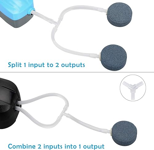 Y and T connectors can split your air tubing to run a second air stone from the same pump. You can also combine two inputs to create a stronger output for use with multi-outlet pumps.