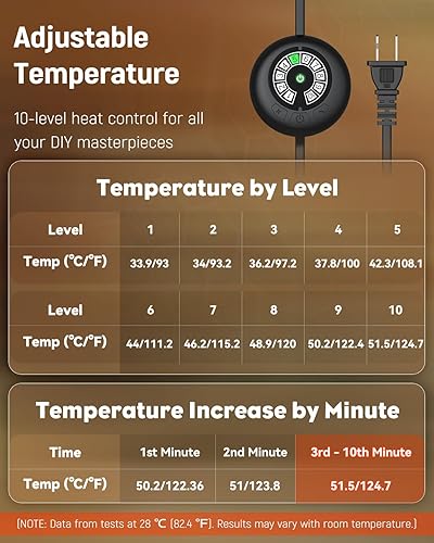 Adjustable Temperature: The handy thermostat offers 10 selectable temperature levels in total. Simply press the “+” or “–” button to customize heat for various resin projects. Also perfect for providing gentle warmth for delicate reptiles