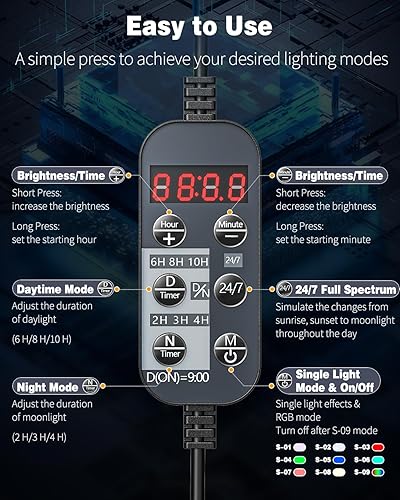 DIY Mode: The multi-colored LEDs allow you to set the starting time through the “hour” and “minute” buttons. It also provides 10 adjustable levels of brightness. Freely adjust the luminance for the growth needs of your fish.