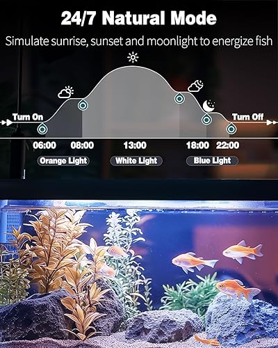 24/7 Natural Mode: The LED light automatically starts at 6 a.m. and turns off at 10 p.m. Simulate the natural changes from sunrise, sunset to moonlight throughout the day, greatly energizing your fish and giving them a sound sleep.