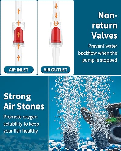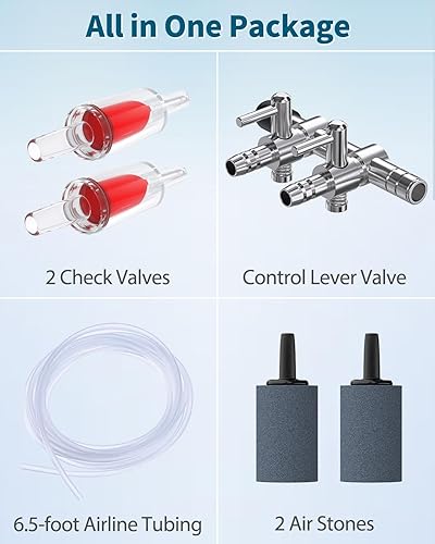 Other Accessories: Include 5-foot airline tubing with standard 3/16" inner diameter and a check valve to prevent back siphoning of water. All help build the basic aeration setup in your fish tank.