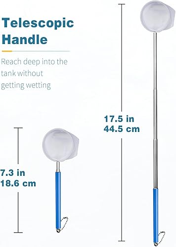 Highly Telescopic Handle: Before extended: 8.6"; After extended: 39". A practical shrimp net to meet your different catching needs in shallow or deep tanks and ponds. The strap at the end of the handle allows for convenient hanging.