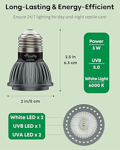 Long-Lasting, Energy-Efficient & Durable: Built with optimized LED beads and a sturdy aluminum alloy housing, this reptile UVB lamp delivers excellent heat dissipation and durability. It lasts up to 20,000 hours—230% longer than traditional CFLs, while its low 3 W power consumption ensures continuous 24/7 lighting for reliable day-and-night reptile care
