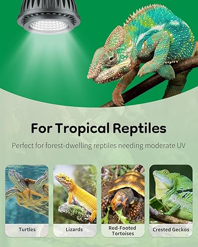 Reptile UVB Light for Tropical Reptiles: Specially designed for tropical forest-dwelling reptiles needing moderate UV exposure. Ideal for turtles, lizards, red-footed tortoise, and more. Use with a reptile heat lamp (not included) for optimal basking