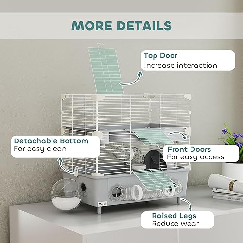 Easy Maintenance: This rodent cage is designed for convenient upkeep, featuring two front doors and a top door for easy access. It includes detachable components and raised legs to safeguard the base.