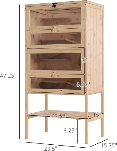 Shelf: Featuring a shelf on the bottom, this wooden hamster cage includes a space for pet items. By keeping everything in a place, the shelf saves storage room needed elsewhere, opening up the cabinets and closets. Sitting on elevated legs, the wood cage will stay protected from dampness and moisture.