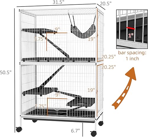 Spacious Size: This large ferret cage offers your pet height to climb for fun and exercise. A hanging hammock is included for a comfortable nap spot at the top. The four-tier layout allows a big, cozy living space.