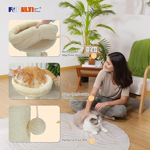 UNIQUE FLOWER DESIGN: The PEQULTI cat scratching post features an oversized flower cat perch [14''X14''], providing your cat with a fluffy bed for resting or napping. Additionally, this adorable pink flower cat bed is removable and washable