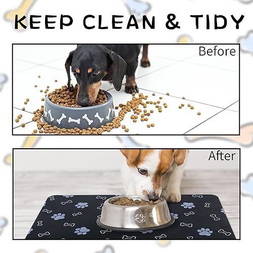 【Super Absorbing & Quick Drying】Our pet food mat is specially designed with a super absorbent material that quickly absorbs any spilled water, the innovative quick-drying technology used in our pet food mat ensures that it dries up fast, helping to keep your floor clean.