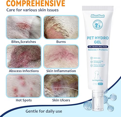 Essential Wound Care for Pet First Aid – BlessMeet Pet Wound Healing Hydro Gel is designed to promote the healing of open wounds,Soothe cuts, scrapes, abrasions, burns, and more and relieve itching and stinging.It works well for common issues like hot spots, interdigital dermatitis, and superficial folliculitis, keeping your furry friend comfortable throughout recovery.
