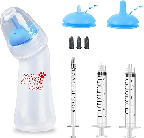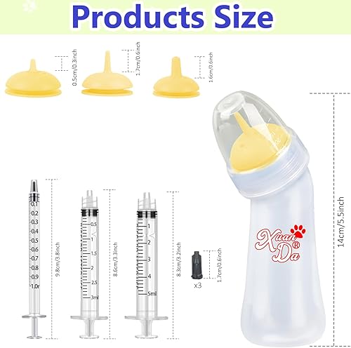 2 Different Types of Nursing Nipple: Bottle pacifiers and syringe pacifiers respectively have small/medium/large sizes ,a total of 6,meet different newborn pet feeding needs, designed by a professional veterinarian, mimics the shape of a pet mother's pacifier, made of food grade silicone, soft and safe, resistant to tearing and biting, all nursing nipples are pre-made 1mm small hole, do not need to cut the nipple.