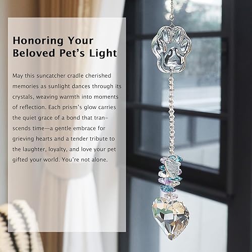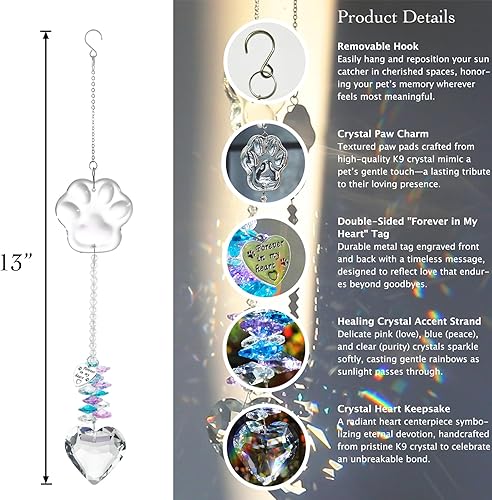 Heartfelt Tribute to Your Pet: Measuring 13 inches in hanging length, this suncatcher is adorned with a delicate crystal paw at the center and a sparkling heart-shaped crystal at the base. Its elegant design ensures it stands out as a heartfelt keepsake, whether displayed indoors or outdoors, in your garden or next to the window.