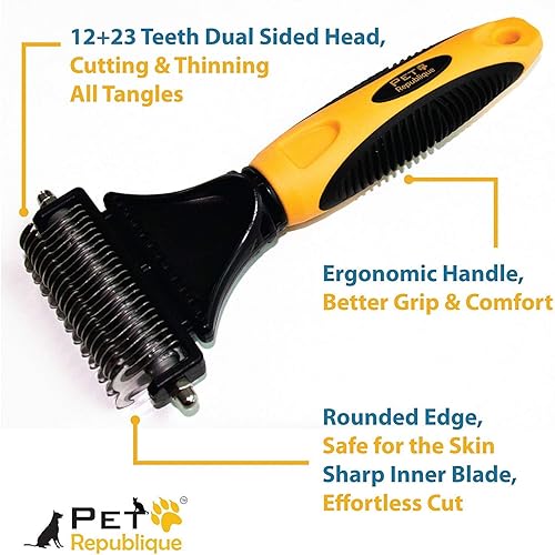 BEST MATS AND TANGLES REMOVER! - The dual sided 12+23 teeth designed matt breaker / detangler give you the best result of de-matting for even the longest and densest coats of dogs, cats, rabbits, long haired breed pets. The 12 teeth side for stubborn tangles and the 23 teeth side for faster results or thinning and de-shedding.