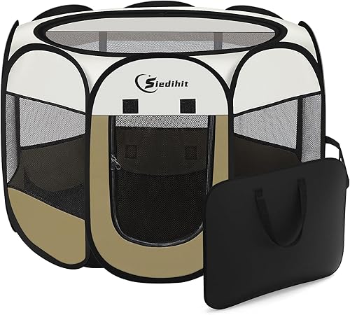 【No Assembly required】Opening the dog pen takes only a few seconds, is lightweight, strong, and does not require assembly. When not in use, it can be folded into the tote bag provided by us, which takes up minimal space and is easy to carry and store. Spacious interior Spaces allow your pet to play, sleep, hide or isolate. Perfect for indoors, lawns, beaches, parks, Tours, camping and more!
