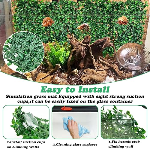 Easy to Install & Maintain: This hermit crab toy comes with 8 strong suction cups that easily attach it to the glass container, making it stable and resistant to falling off. Unlike real plants, the artificial climbing wall lizard toy does not require any special maintenance, the fake grass wall can be easily cleaned with a water river brush to keep its vibrant green appearance