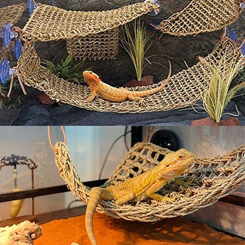 High Quality Material:Climbing hammock for reptiles are made of 100% natural seagrass fiber material,All by handwoven,soft and very durable. Give pet reptiles a place to safe rest and will love the comfortable and climbable lounger