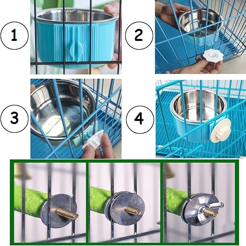 [EASY TO INSTALL]Food bowl installation: Remove the white plastic lock by turning counterclockwise, place the bowl in its proper place in the cage, then turn the white plastic lock clockwise and tighten it.The bird Standing perch comes with metal screws and gaskets,It is also easy to install and requires no other tools