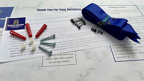 Ribbons, safety pins, spacers, screws, wall plugs and instructions included