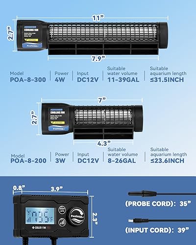 [Easy to Use]:The aquarium chiller fan operates on a stable and safe DC12V input voltage, ensuring reliable performance. With the capability to be mounted on fish tank walls up to 25mm (0.98”) thick, installation is convenient. Measuring 10.59” in length, this fan is recommended for tanks ranging from 11 to 39 gallons to guarantee optimal cooling efficiency