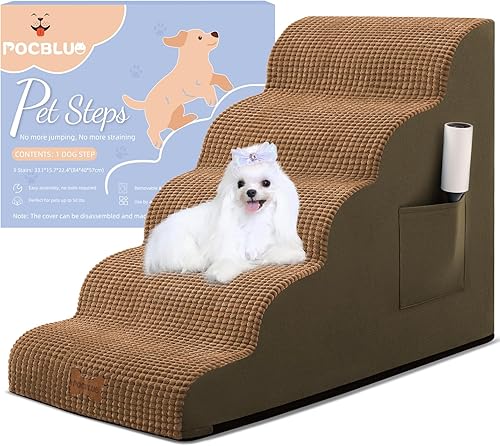 EASY TO INSTALL AND CLEAN: POCBLUE dog stairs feature a removable, machine-washable coral fleece fabric cover with a waterproof backing to protect the sponge from water damage. For added convenience, the stairs are vacuum-sealed for compact packaging. Simply unpack, let the sponge fully expand within 48 hours, and your stairs will be ready for use—no assembly required!