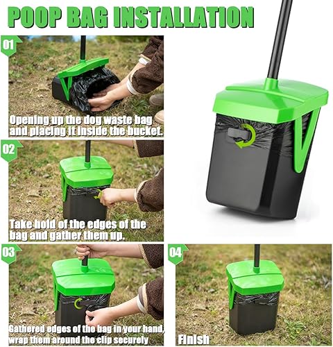 Easy & Sanitary Clean-Up with Poop Bags. With our 100 bags and clip, setup is a breeze in just seconds: ①Opening up the dog waste bag and placing it inside the bucket.②Take hold of the edges of the bag and gather them up.③ Gathered edges of the bag in your hand, wrap them around the clip securely.