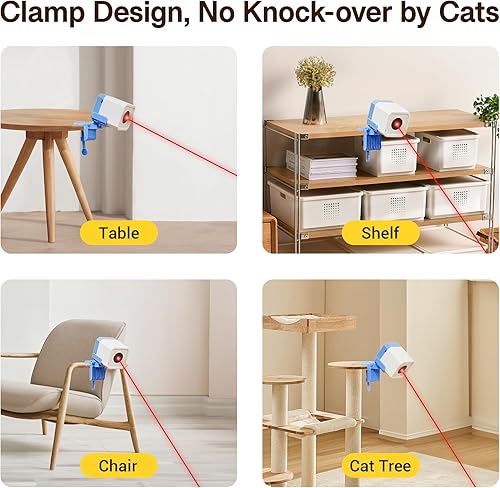 Sturdy Clamp Design: Say goodbye to toys that easily topple! Whether it's clamped to a desk, shelves, nightstand, or other surfaces, our laser toy's innovative clamp design ensures it stands firm, even against the most energetic of cats. No more interruptions, just continuous play.