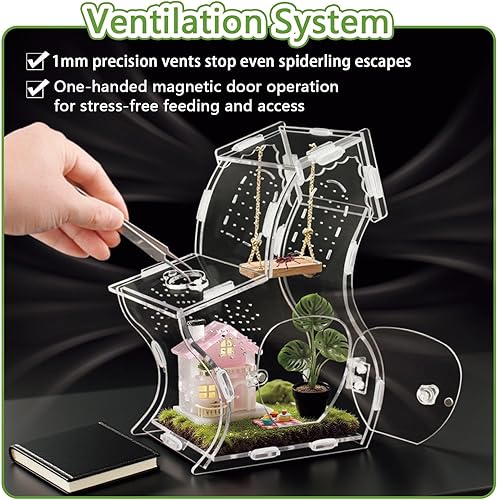 Designed for ease of use, the strong magnetic feeding doors and bayonet locking system allow for smooth, one-handed operation. This tool-free access minimizes escape risks and stress during feeding, maintenance, or simply enjoying your pet. No more fumbling with clumsy clips or latches that can harm your delicate invertebrates.